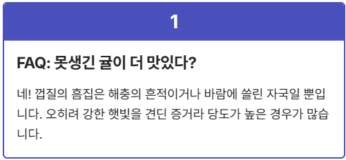 A: 네, 일반적으로 그렇습니다. 검은 반점은 주로 '귤응애'라는 해충의 흔적이나 바람에 의한 스크래치입니다. 이는 귤의 품질과는 무관하며, 오히려 햇빛을 많이 받아 당도가 높다는 신호일 수 있습니다. 깨끗한 귤보다는 못생겨도 진한 맛을 가진 귤을 고르세요!