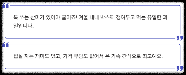 - "귤의 **신맛을 정말 싫어하는 저에게는 인생 귤**이었습니다. 단맛이 강한데도 물리지 않아서 순식간에 사라져요!"