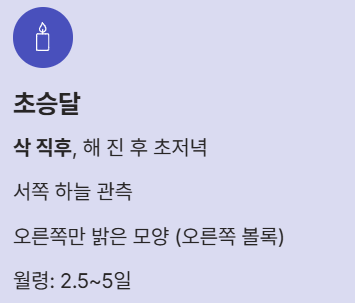 | 관측 시기 | **삭 직전**, 해 뜨기 전 새벽 | **삭 직후**, 해 진 후 초저녁 |