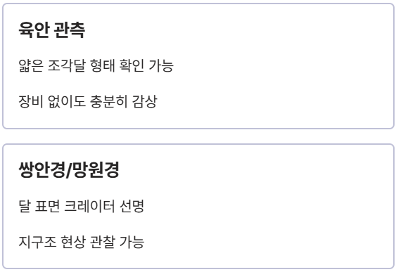 그믐달은 얇은 조각달이라 육안으로도 충분히 그 신비로운 모습을 감상할 수 있어요. 하지만 쌍안경이나 작은 망원경을 사용하면 달 표면의 크레이터(분화구)와 신비한 지구조를 훨씬 더 선명하게 볼 수 있답니다.