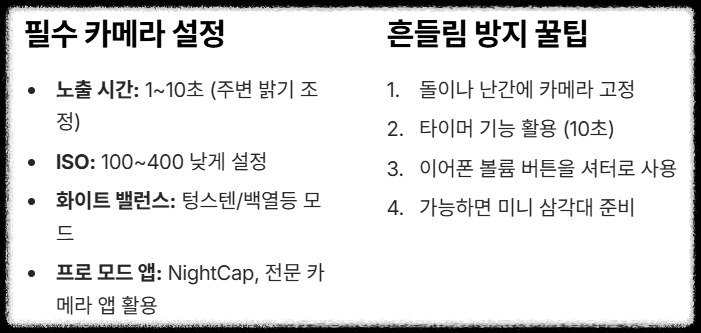 기본 카메라 앱보다는 수동(프로) 모드 설정이 가능한 앱을 추천합니다. iOS의 NightCap 앱이나 안드로이드의 전문 카메라 앱을 활용해 보세요.