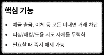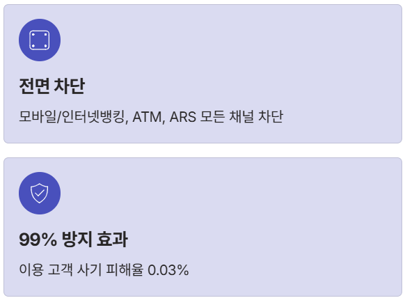 | **전면 차단** | 인터넷/모바일/ATM 등 모든 비대면 거래 | 사기 피해율 99% 차단 (최고 수준) |
