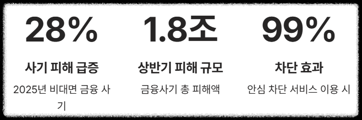 요즘 부쩍 심해진 AI 딥페이크, 보이스피싱 때문에 스트레스받으시는 분들 많으시죠? 실제로 2025년 들어 비대면 금융 사기 피해가 **28%**나 급증했습니다. 하지만 단 1분만 투자하면 사기 피해를 **99%**까지 막을 수 있는 서비스가 있습니다. 바로 **금융거래 안심 차단 서비스**입니다.
