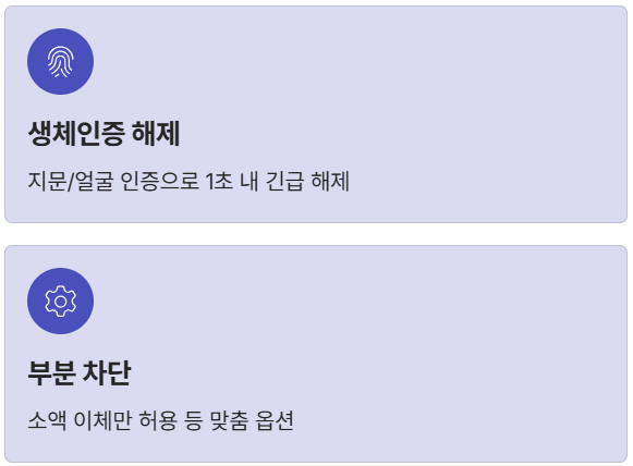 - **신규! 생체인증 자동 해제:** 차단 해제 시, 지문/얼굴 등 생체인증이 확인되면 즉시 해제되어 긴급 상황 대처가 1초 이내로 빨라졌습니다.