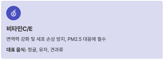 | 비타민C/E | 면역력 강화 및 세포 손상 방지, PM2.5 대응에 필수 | 청귤/유자, 견과류 |