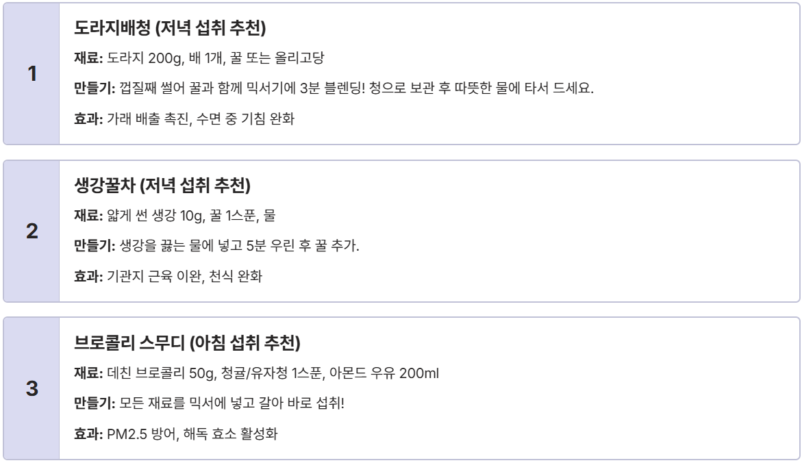 - 최적의 섭취 타이밍: 아침에는 마늘/브로콜리로 면역 강화, 저녁에는 도라지/생강으로 가래 완화에 집중하세요.