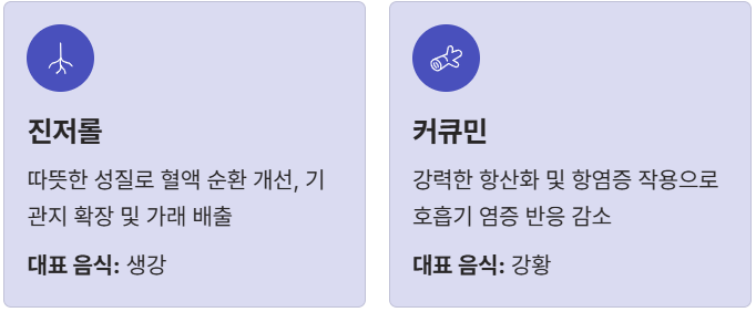| 진저롤 | 따뜻한 성질로 혈액 순환 개선, 기관지 확장 및 가래 배출에 도움 | 생강 |