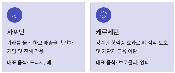 | 케르세틴 | 강력한 항염증 효과, 폐 점막 보호 및 기관지 근육 이완 | 브로콜리, 양파 |
