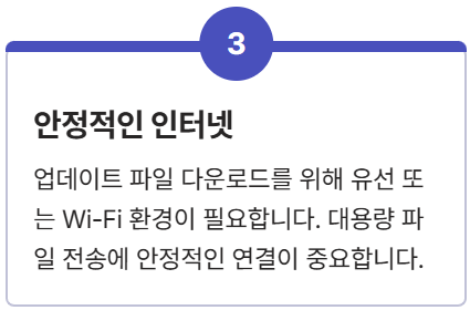 - **인터넷 연결 환경:** 업데이트 파일 다운로드를 위해 안정적인 유선 또는 Wi-Fi 환경이 필요합니다.