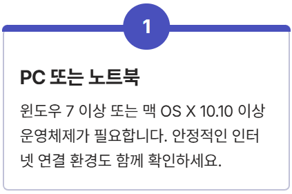 - **PC 또는 노트북:** 윈도우(Windows 7 이상) 또는 맥(Mac OS X 10.10 이상) 운영체제 환경.