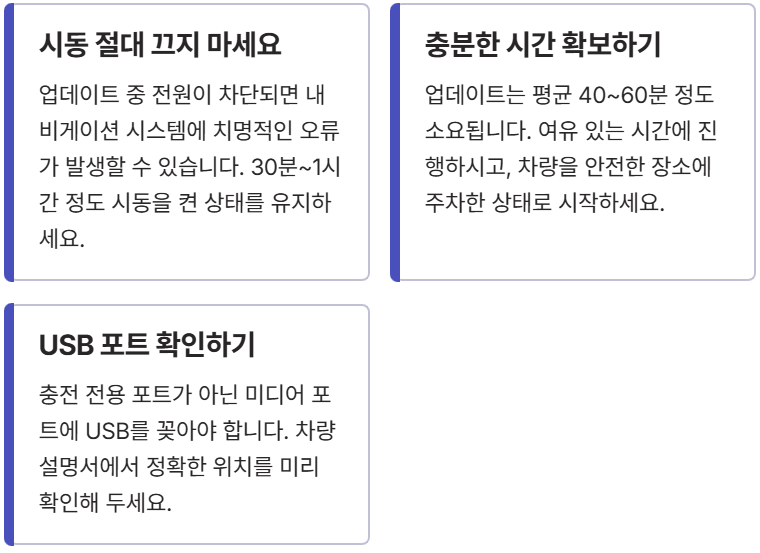 차량 내에서 업데이트 파일을 설치하는 동안에는 **절대로 시동을 끄면 안 됩니다.** 업데이트 중 전원이 차단되면 내비게이션 시스템에 치명적인 오류가 발생할 수 있습니다. 넉넉히 30분~1시간 정도 운행 가능한 상태(시동 켜짐)를 유지하는 것이 가장 안전합니다.