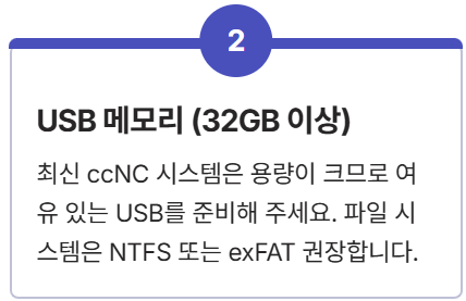 - **USB 메모리 (또는 SD카드):** 용량은 **32GB 이상**을 권장합니다. 특히 최신 모델(ccNC 시스템)의 경우 용량이 크니 여유 있는 것을 준비해 주세요. 파일 시스템은 NTFS 또는 exFAT이 좋습니다.