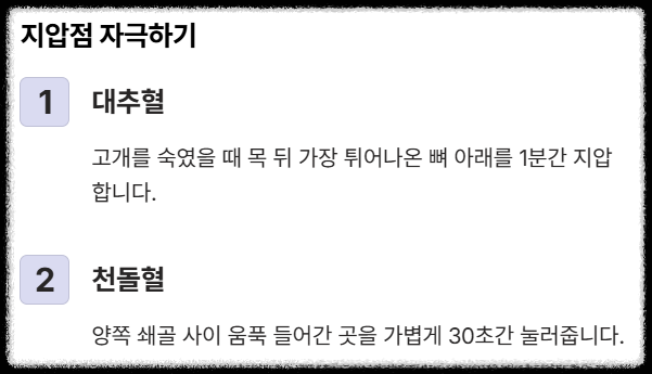 | 대추혈 | 고개를 숙였을 때 목 뒤 가장 튀어나온 뼈 아래. 1분간 지압. |