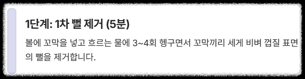 - 팁: 이 과정을 통해 꼬막 껍질 표면의 뻘 90% 이상이 제거되어, 해감 시 꼬막의 내부 뻘 제거에만 집중할 수 있게 됩니다.
