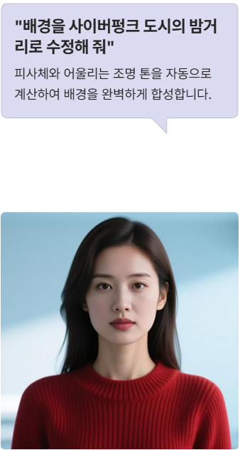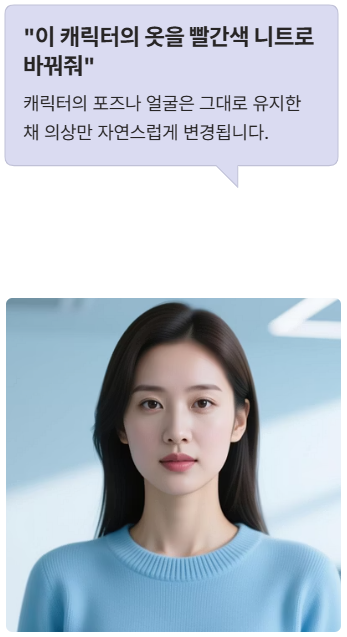 생성된 이미지를 수정하고 싶을 때, "이 캐릭터 옷을 빨간색 니트로 바꿔줘", "배경을 네온사인이 빛나는 사이버펑크 도시로 수정해 줘"처럼 말로 요청만 하면 끝입니다. 따로 마스킹하거나 복잡한 툴을 다룰 필요가 없어요. 이게 바로 진정한 **자연어 이미지 편집**의 시대죠.