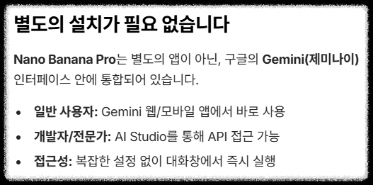 나노 바나나 프로는 구글의 최신 범용 AI 모델인 **Gemini 2.5 Flash 및 Pro에 내장된 비전(Vision) 기술**을 활용한 이미지 생성 엔진입니다. 따라서 별도의 웹사이트가 아닌, **Gemini 앱 인터페이스**를 통해 접근하고 사용하게 됩니다!