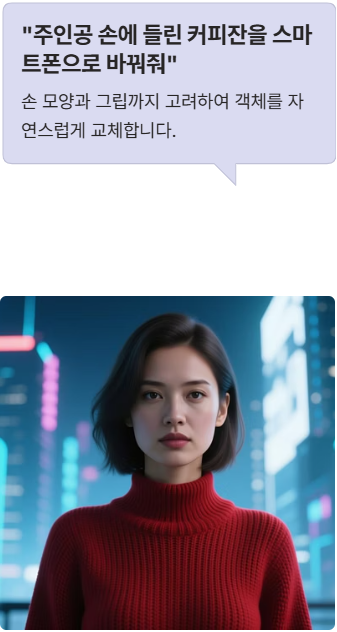 수십 장의 컷에서 동일한 캐릭터의 얼굴, 복장, 분위기를 유지해야 할 때, **AI 이미지 일관성** 기능이 빛을 발합니다. 하나의 레퍼런스 이미지로 수백 개의 장면을 순식간에 만들어 낼 수 있어요. - **2. 복잡한 이미지의 자연스러운 배경/조명 편집**