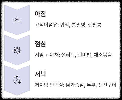 | 저녁 (저지방 단백질) | 닭가슴살 야채찜 (들기름 드레싱) | 두부 스테이크 & 시금치 나물 | 저염 생선구이 (삼치/고등어) |
