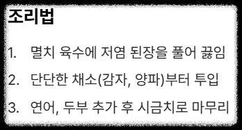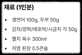 - 재료: 생연어 100g, 두부 50g, 감자/양파/애호박/시금치 각 50g, 멸치 육수 300ml, 저염 된장 0.5큰술 (일반 된장의 1/3)