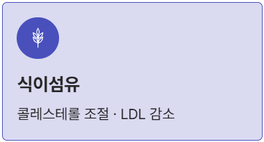 - 귀리/렌틸콩: 수용성 식이섬유(베타글루칸)가 콜레스테롤 흡수 차단. 밥에 섞거나 죽으로 섭취.