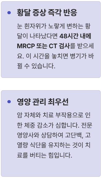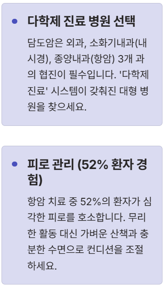- 2. 다학제 진료 병원 선택: 담도암은 외과, 소화기내과(내시경), 종양내과(항암) 3개 과의 협진이 필수입니다. '다학제 진료' 시스템이 갖춰진 대형 병원을 찾으세요.