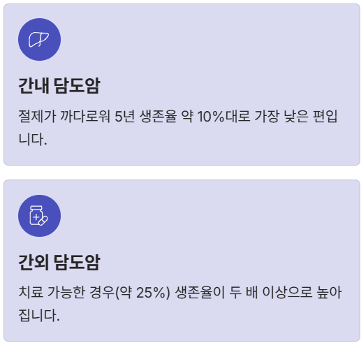 | 담도암 병기 | 5년 생존율 (2025년 기준) | 주요 특징 |