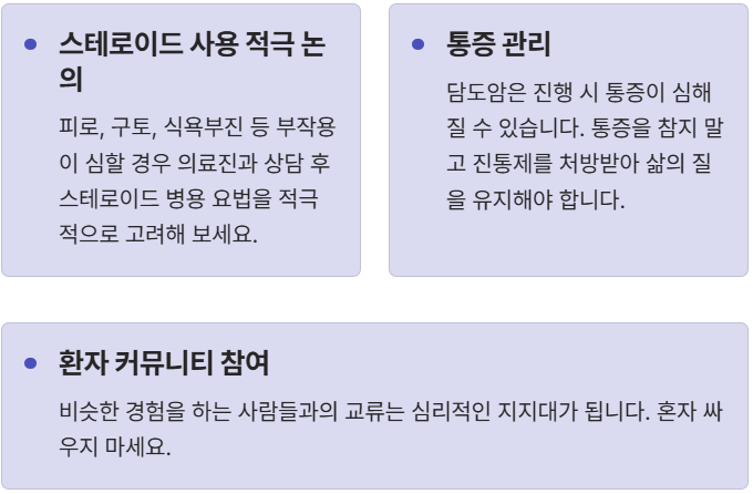 - 6. 통증 관리: 담도암은 진행 시 통증이 심해질 수 있습니다. 통증을 참지 말고 진통제를 처방받아 삶의 질을 유지해야 합니다.