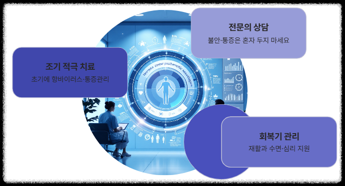 대상포진은 우리 몸이 보내는 강력한 '휴식 권고'입니다. 통증이 가라앉은 후에도 충분한 영양 섭취와 수면을 통해 면역 체계를 재정비해야 대상포진 후 신경통이라는 무서운 후유증을 피할 수 있습니다.