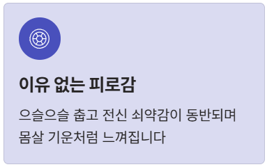- 이유 없는 피로감: 으슬으슬 춥고 전신 쇠약감이 동반됩니다.
