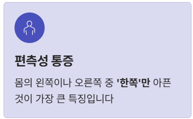 - 편측성 통증: 몸의 왼쪽이나 오른쪽 중 '한쪽'만 아픈 것이 특징입니다.