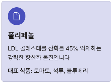 - 2. 폴리페놀 (항산화 물질): 동맥경화의 주범인 LDL 콜레스테롤이 산화되는 것을 45% 억제합니다. 특히 토마토(라이코펜),석류, 블루베리 등 베리류가 효과적이죠.
