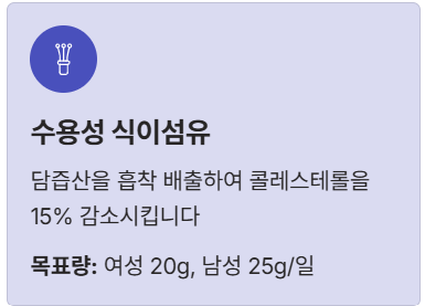 - 3. 수용성 식이섬유: 장내에서 담즙산(콜레스테롤로 만들어짐)을 흡착해 배출시키면서 콜레스테롤을 15% 낮춥니다. **매일 여성20g, 남성25g/일** 섭취가 목표입니다.
