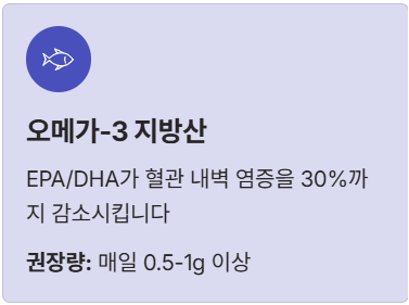 - 1. 오메가-3 지방산 (EPA/DHA): 혈관 내벽 염증을 무려 30%까지 줄여줍니다. 심장학회 지침에 따르면 **매일 0.5-1g 이상** 섭취를 권장합니다.