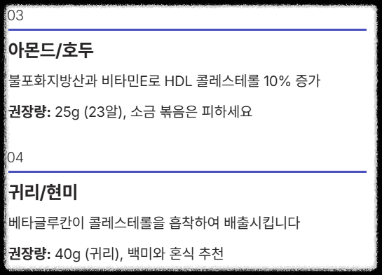 | 4위 | 귀리/현미 | 베타글루칸 (수용성 식이섬유), 콜레스테롤 흡착/배출 | 40g (귀리) | 백미와 혼식 |