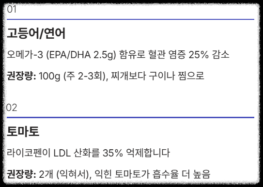 | 1위 | 고등어/연어 | 오메가-3 (EPA/DHA 2.5g) 함유, 혈관 염증 25%↓ | 100g (주 2~3회) | 찌개(소금) X,구이/찜O |