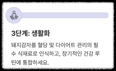 - 3단계 (생활화): 돼지감자를 혈당 및 다이어트 관리의 필수 식재료로 인식하고, 장기적인 건강 루틴에 통합하세요.