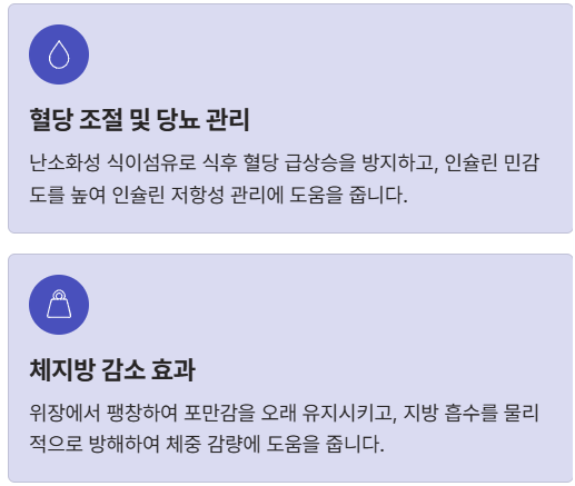 - 지방 흡수 방해: 장내에서 지방이 흡수되는 것을 물리적으로 일부 방해하는 효과도 있어, 체중 감량에 간접적으로 도움을 줍니다.