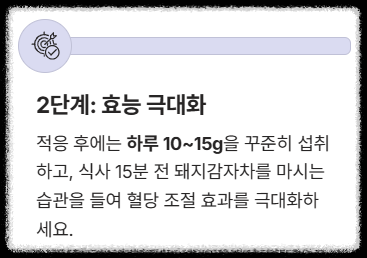 - 2단계 (효능 극대화): 적응 후에는 **하루 10~15g**을 꾸준히 섭취하고, 식사 15분 전 돼지감자차를 마시는 습관을 들여 혈당 조절 효과를 극대화하세요.