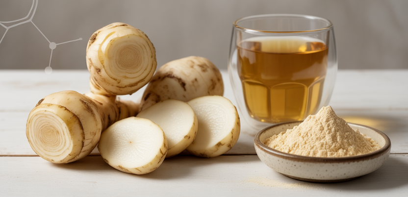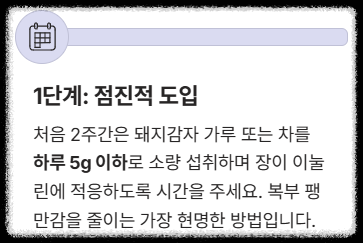 - 1단계 (점진적 도입): 처음 2주간은 돼지감자 가루 또는 차를 **하루 5g 이하**로 소량 섭취하며 장이 이눌린에 적응하도록 시간을 주세요. 복부 팽만감을 줄이는 가장 현명한 방법이에요.