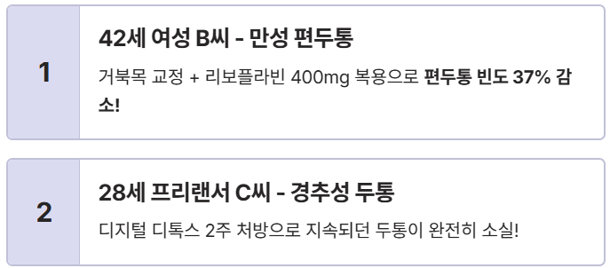 "아이 둘 키우면서 스트레스 폭발! 편두통 빈도가 한 달에 15번을 넘기더라고요. 저는 거북목 교정 치료를 병행하면서 리보플라빈(비타민 B2) 400mg을 꾸준히 복용했어요. 6개월이 지난 지금, 편두통 빈도가 **37% 이상 줄었어요!** 약물 치료 없이도 이렇게 좋아질 수 있다니 정말 놀라웠죠."
