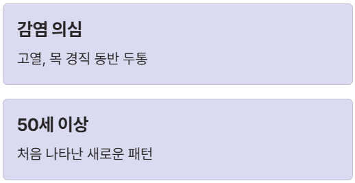 - 기존 두통 패턴이 **갑자기 악화**되거나 변화한 경우