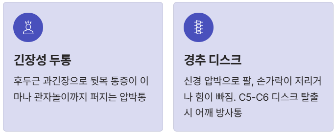 | **② 근막통증 증후군** | 승모근, 경추 승모근의 트리거 포인트 (딱딱한 매듭) 발생, 누르면 심한 통증 |