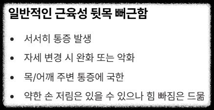 | 주로 목/어깨 주변 통증에 국한됨 | 심한 어지럼증, **구토**, **발음 장애**, 시야 장애 동반 |
