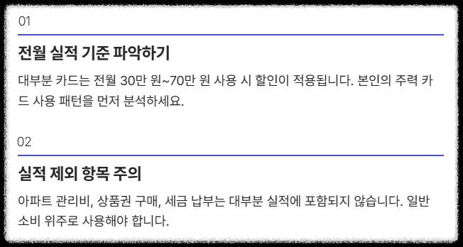 카드 할인 혜택을 지속적으로 받으려면 매월 '전월 실적'을 채우는 것이 핵심입니다. 대부분의 경우 **아파트 관리비, 상품권 구매, 세금 등은 실적에 포함되지 않아요.** 주력 카드 사용액이 실적 기준(예: 30만원 또는 70만원)을 초과하는지 매월 꼼꼼하게 따져봐야 합니다