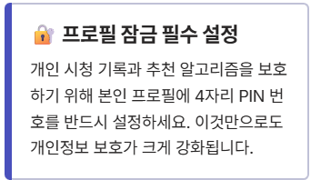 - **프로필 잠금 필수:** 개인 시청 기록과 추천을 보호하기 위해 본인 프로필에 **4자리 PIN 번호**를 설정하는 것은 기본입니다.