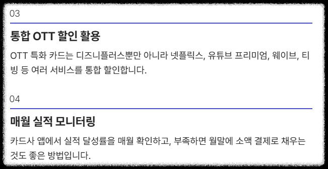 | OTT 특화 카드 | 월 5,000원~20,000원 캐시백 | 통신사 관계없이 모든 OTT 통합 할인 가능 |
