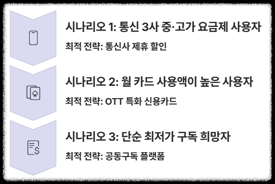 - 시나리오 3: 통신사/카드 변경 없이, 최소 비용으로 단순 구독만 희망하는 사용자👉 최적 전략: 공동구독 플랫폼 이용
