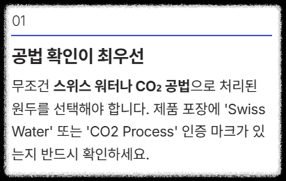 - 공법 확인 (1순위): 무조건 스위스 워터나 CO2 공법으로 처리된 원두를 선택해야 합니다. 이는 원두 본연의 풍미를 가장 잘 유지하는 방법입니다.