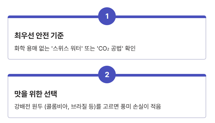 - 안전한 공법 확인: 스위스 워터 프로세스(SWP) 또는 CO2 초임계 추출법이 적용된 제품인지 라벨을 꼭 확인하세요.
