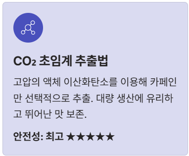 | 2. CO2 초임계 추출법 | 고압의 액체 이산화탄소를 이용해 카페인만 선택적으로 추출. 대량 생산에 유리하고 뛰어난 맛 보존. | 매우 안전(최고), 맛 우수 |